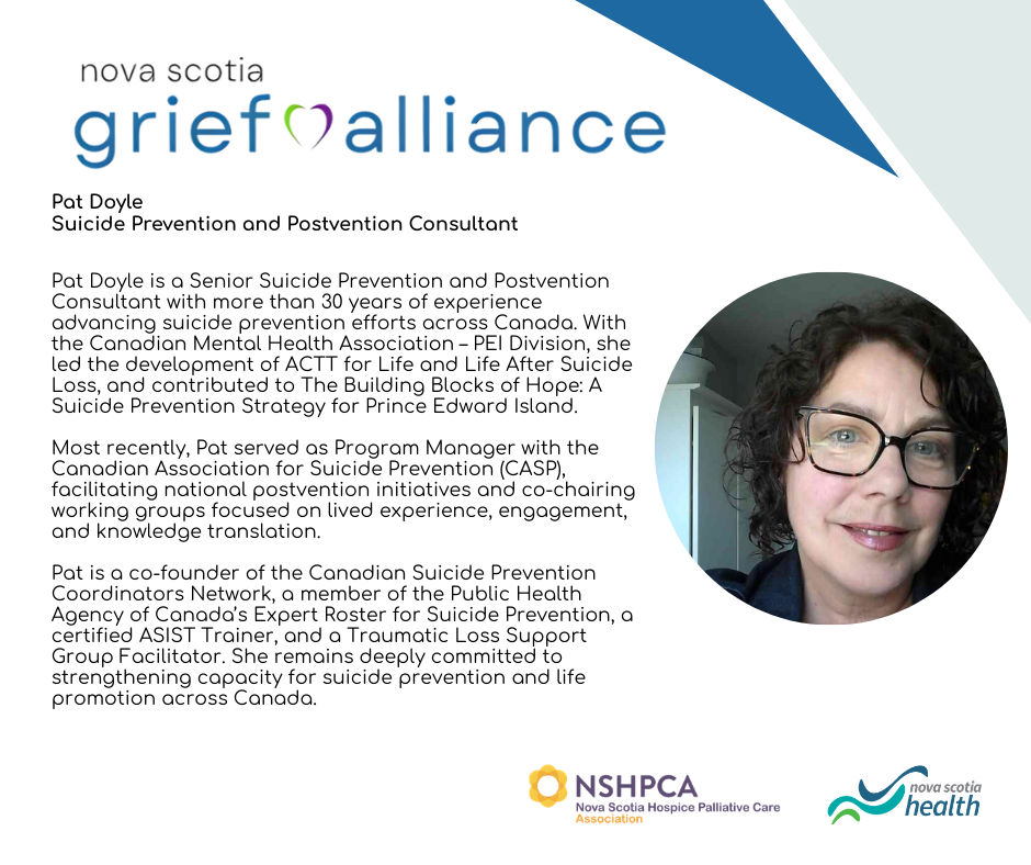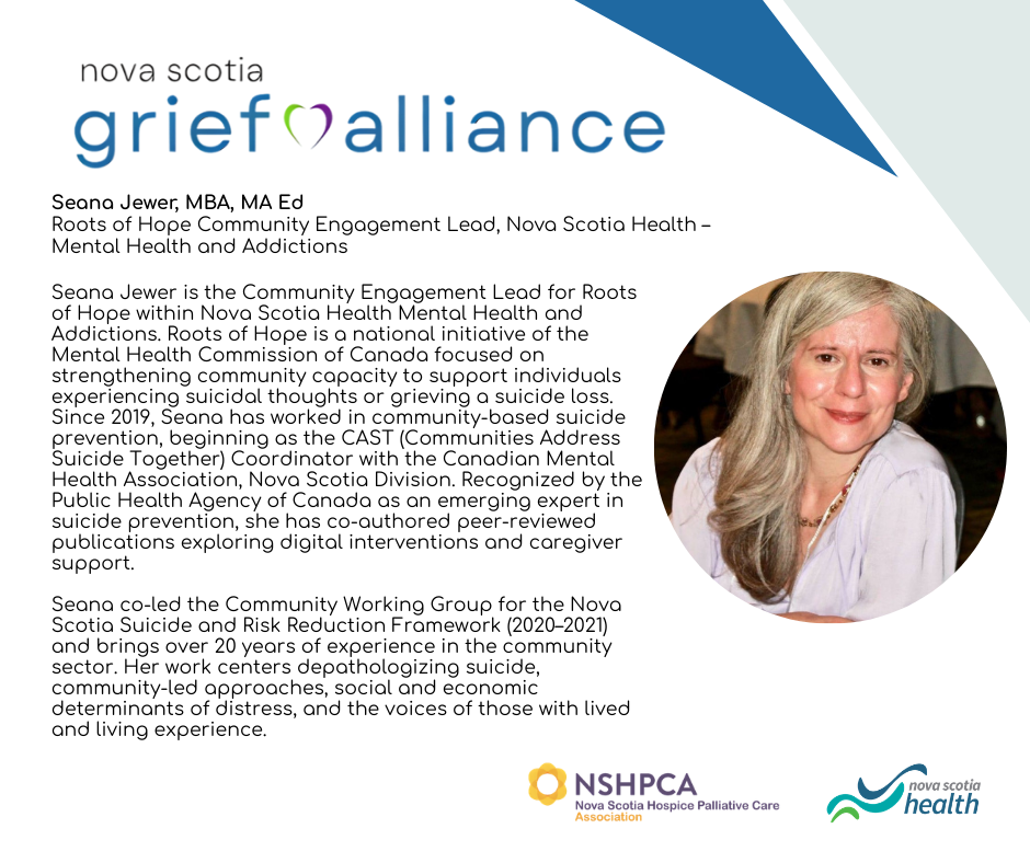 Speakers/Presenters: Seana Jewer, MBA, MA Ed - Roots of Hope Community Engagement Lead, Nova Scotia Health – Mental Health and Addictions & Pat Doyle - Suicide Prevention and Postvention Consultant.